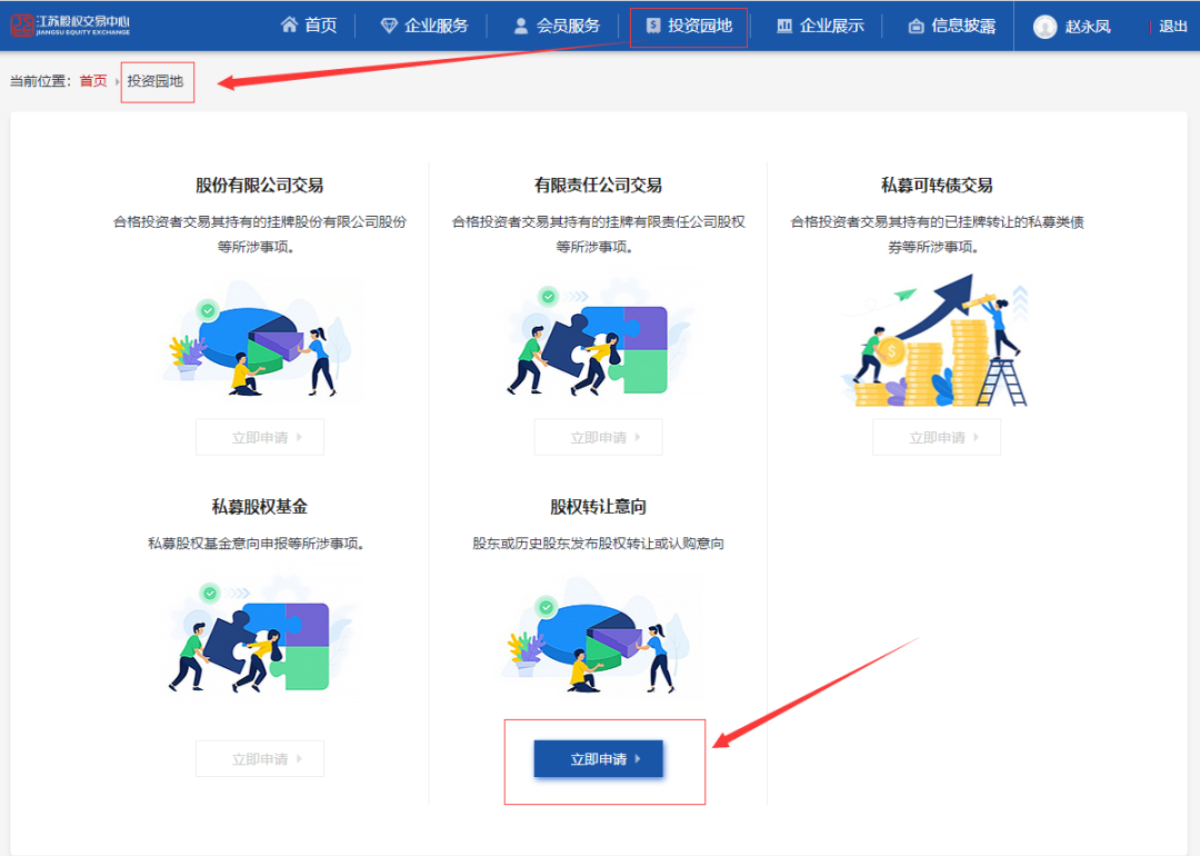 通过浏览器打开江苏股权交易中心官网,注册/登录后,点击“投资园地”-“股权转让意向”,即跳转至信息详情页。