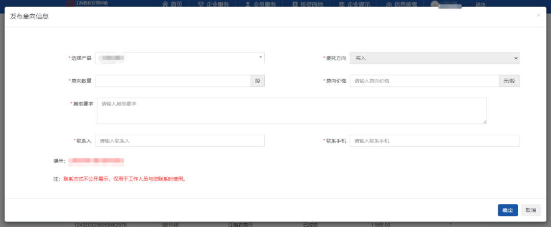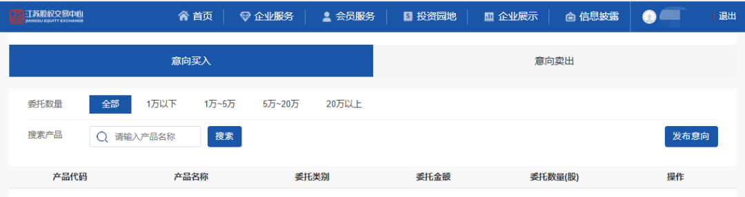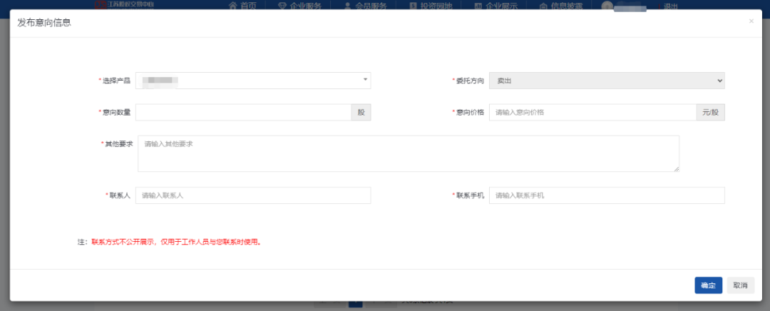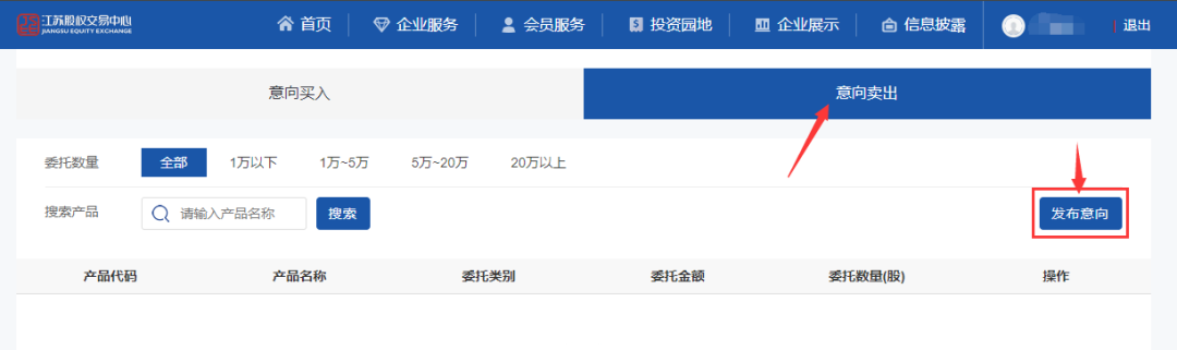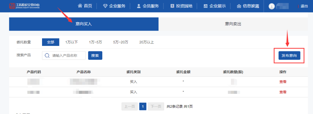 在信息详情页,选择目标产品、选定委托方向(“意向买入”/“意向卖出”)、点击“发布意向”,在弹窗中填写意向买入/卖出的股权数量和价格等信息,点击“确定”即发布成功。