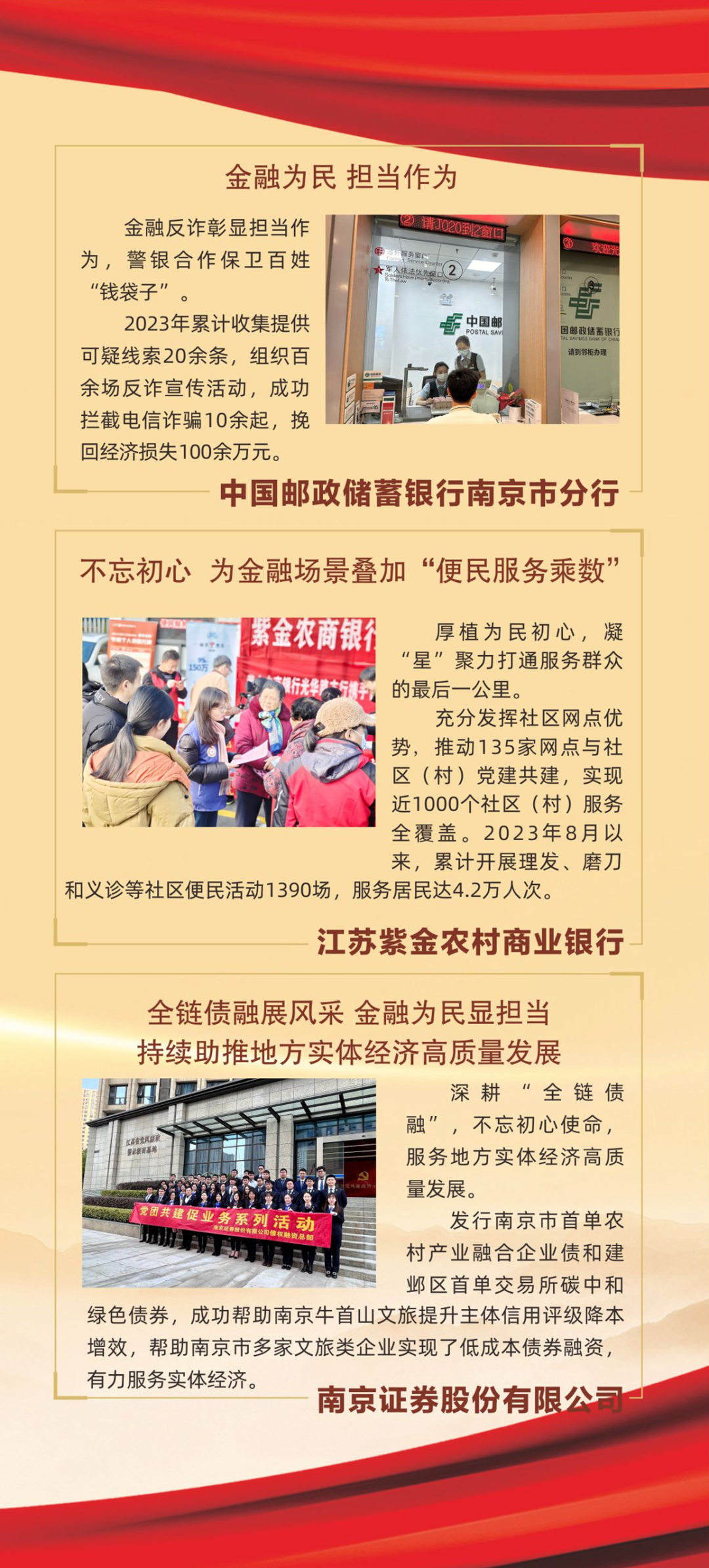 下一步,全市金融系统将以此次活动为契机,坚持党建引领,以更高站位、更实举措、更严作风、更大力度推进南京金融高质量发展:抓统领,坚持党对金融工作的集中统一领导;抓基础,坚持南京地方金融系统党的建设强基固本不动摇;抓机制,坚持用制度管人管事管权;抓创新,坚持用创新加速助力南京新质生产力主阵地建设;抓争先,坚持打造南京地方金融系统的优质品牌和良好形象;抓统筹,坚持推动南京金融高质量发展助力强富美高新南京建设;抓队伍,坚持始终不懈抓好南京金融人才队伍建设。齐心协力、奋发进取,在金融为民中作出新的更大的贡献,在建强支部中彰显更大的使命担当,不断谱写南京金融高质量发展的新篇章!