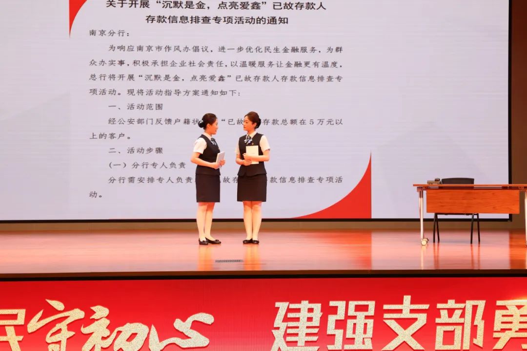 金融一头连着宏观经济大盘,一头连着千家万户对美好生活的向往。大会现场,南京银行运营管理部的党员群众代表通过情景剧形式讲述《沉默是金、点亮爱“鑫”,让金融服务更有温度》,紫金农商银行党员代表孙宇带来演讲《当好“三个角色”,践行农村金融初心使命》,南京证券债权融资总部的党员代表带来情景剧《宁证赋能三重奏》,南京银润典当有限公司代表高雅带来演讲《服务有心 典当有信》,不同的表演形式展示出了金融为民本色,赢得了现场观众共鸣,收获了阵阵掌声。