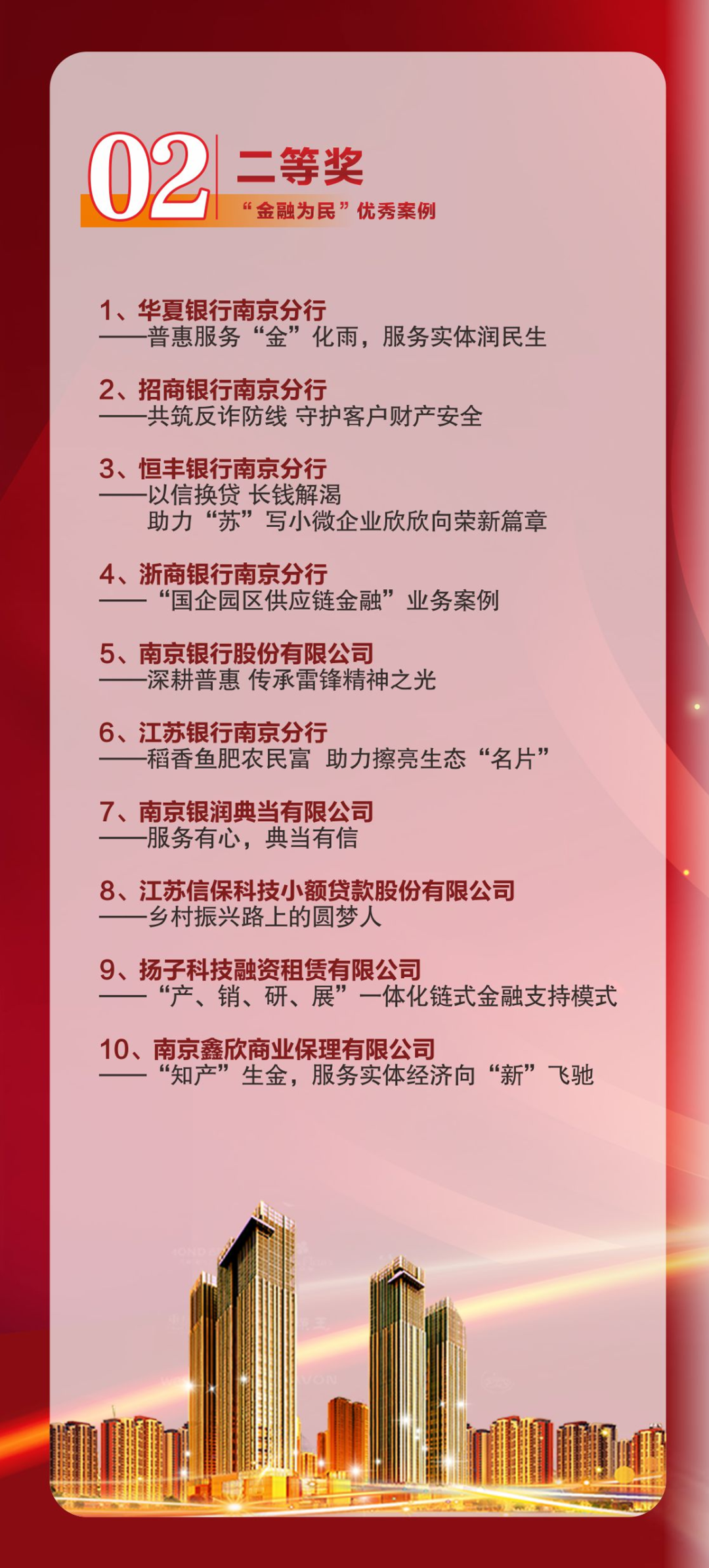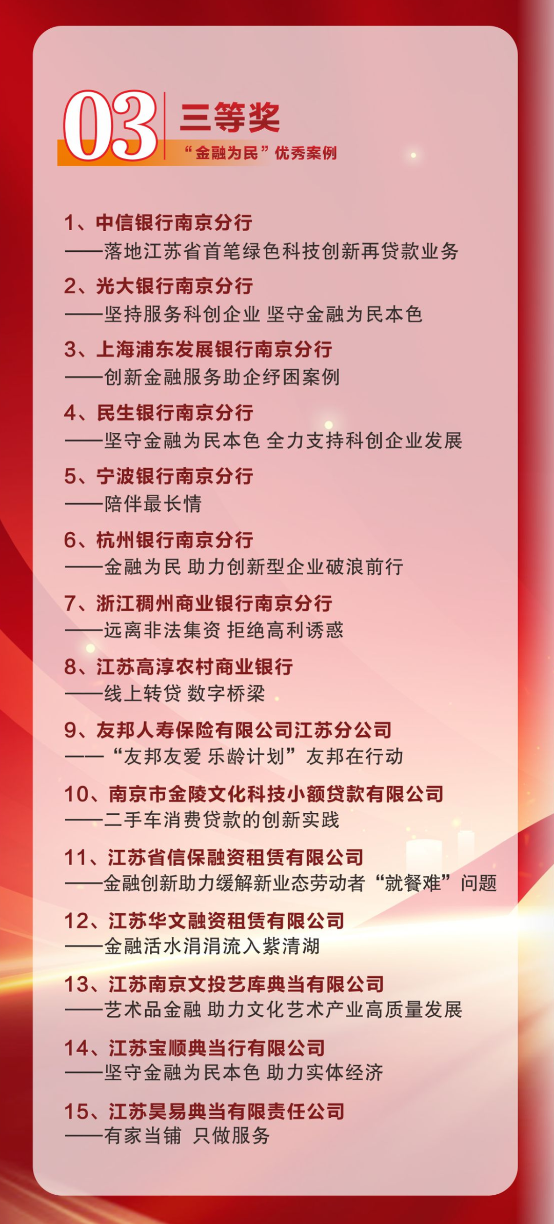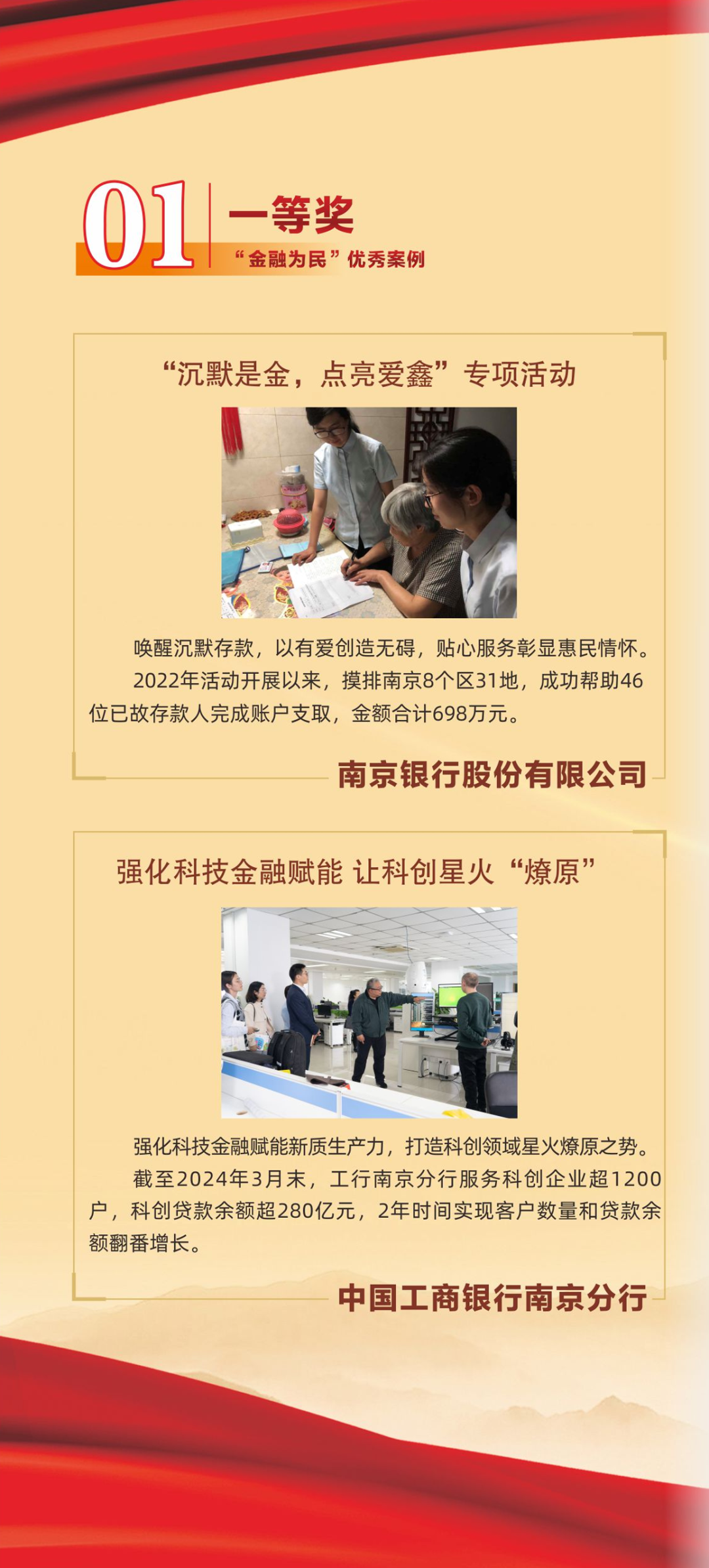 今年5月,市委金融工委以“坚守金融为民本色”为主题,开展优秀案例征集活动,引导全市金融企业提高服务水平,不断增强群众和企业对金融服务的获得感和满意度。经过多轮评审,评选出一等奖8名,二等奖10名,三等奖15名。其中,南京银行股份有限公司的“ ‘沉默是金,点亮爱鑫’专项活动”、中国工商银行南京分行的“强化科技金融赋能 让科创星火‘燎原’”、中国农业银行南京分行的“金融为民 南京农行‘贷’动夏粮收购‘粮满仓’”等8个优秀案例荣获一等奖。当天的活动现场,主办方为获奖的金融企业颁奖。